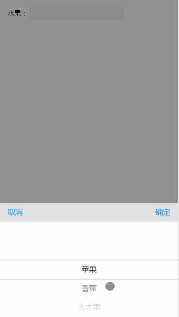 new Picker(options),一个最简单的例子如下:var fruit = ['苹果','香蕉','火龙果','芒果','百香果']; new Picker({ target: 'fruit', data: fruit });其中,