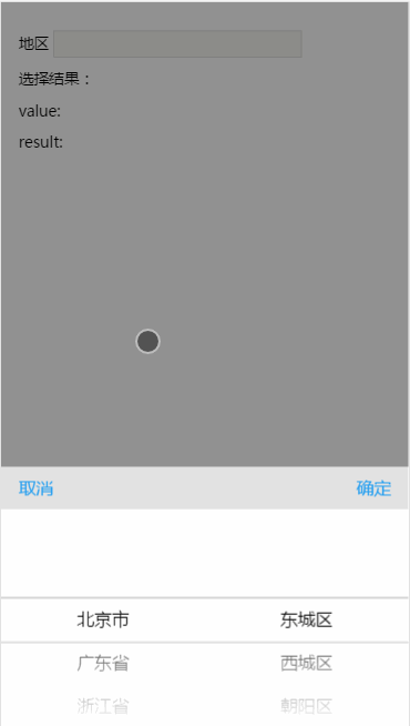 confirm Function(value,result) 确定选择后的回调函数接收两个参数value为选择器文本拼接后的结果默认用于填充元素result为选择的原始数据出去子级列表后的集合,如[{text:'广州市'}{text: '天河区'}]