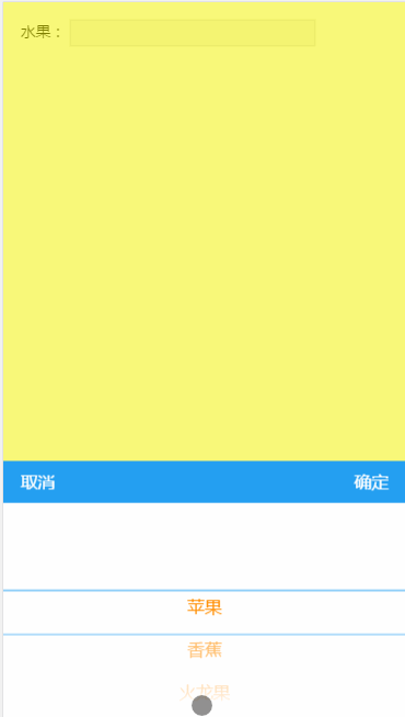其中,target为触发picker显示的目标元素值为元素的id或者dom元素data为需要实例化供选择的数据集合。 以上代码执行结果如下图所示: