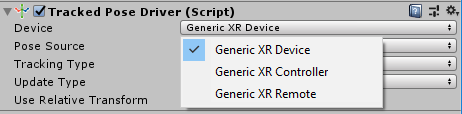 If a requested source pose is not valid, Unity provides a position vector that consists of zeros and an identity quaternion. The following image shows the possible values for the Pose Source field when the Device is set to Generic XR Device.