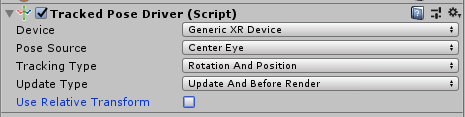 The Use Relative Transform option allows you to control how the pose source is applied to the target transform. For instructions on how to migrate your project to use the recommended XR Rig please see the Migrating to the XR Plugin Framework section in this document.