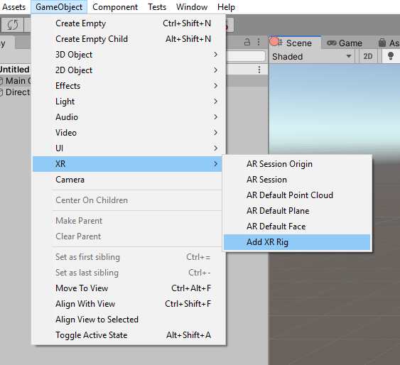 For example, the following image shows a new Scene that can be converted using the Add AR Rig option: