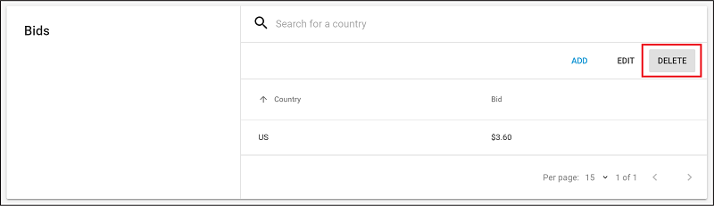 To delete an existing bid, click DELETE, then select the bid(s) to delete. Select bids using the Search tool, by country, or in bulk by region.