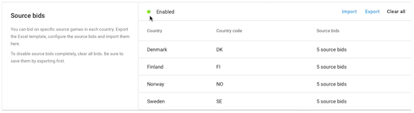 Once you have successfully imported your configuration, the Source bids section will display a list view of the countries you are targeting, and the bid amounts imported from your spreadsheet. A green icon indicates that source bidding is enabled and active.