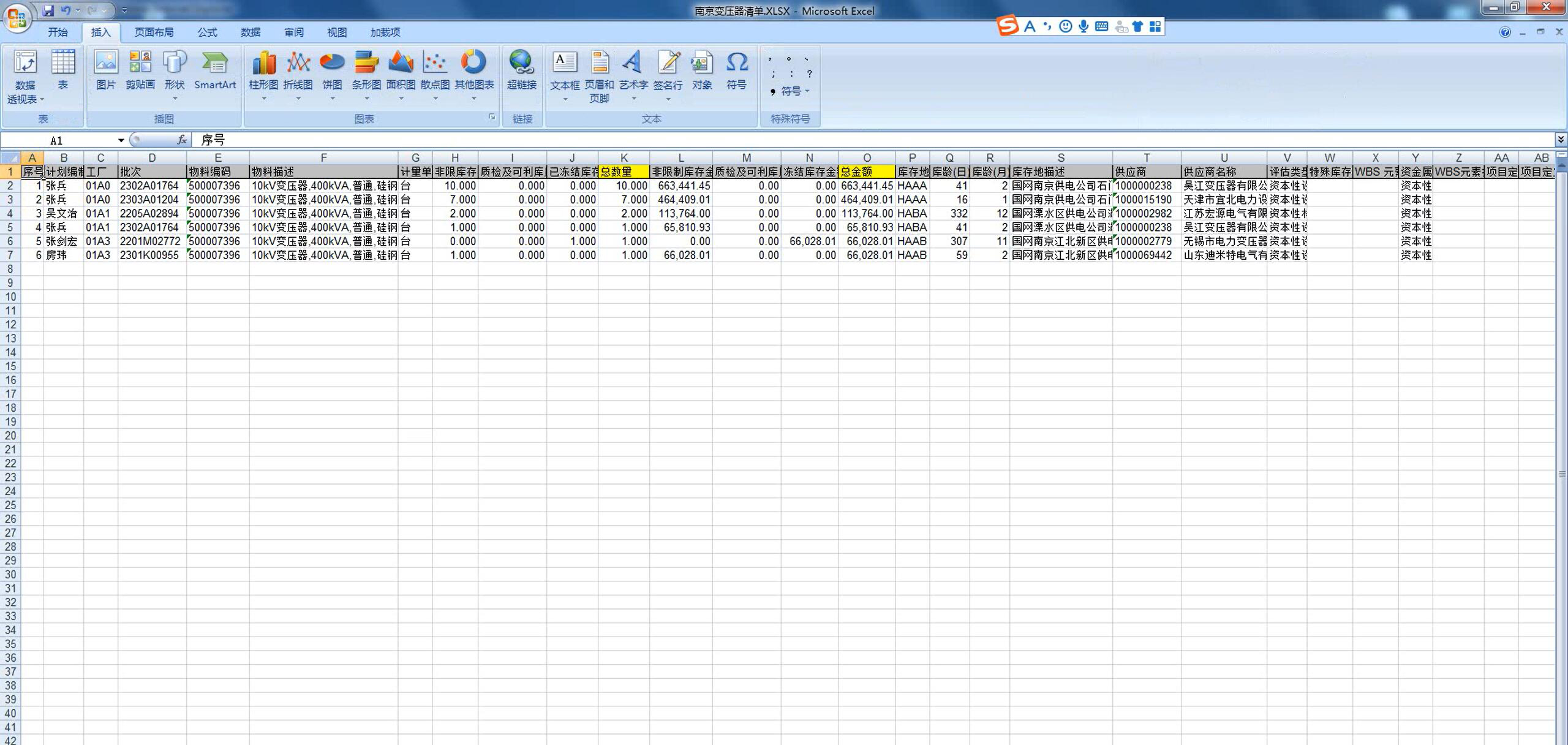 分析全市库存500001165物料号的变压器总库存